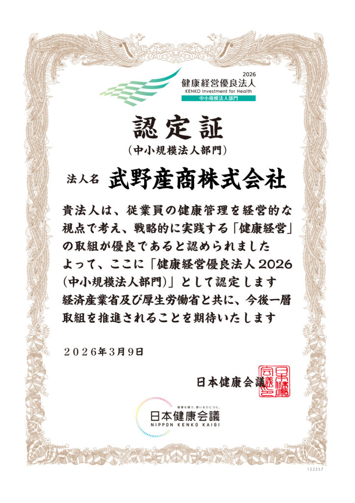 2026.04.06 お知らせ 「健康経営優良法人2026」に認定されました 本年度も経済産業省及び日本健康会議が主催する健康経営優良法人認定制度において「健康経営優良法人2026(中小規模法人部門)」に認定されました。 健康経営優良法人認定制度とは、地域の健康課題に即した取組や日本健康会議が進める健康増進の取組をもとに、特に優良な健康経営を実践している大企業や中小企業等の法人を顕彰する制度です。 今後も健康経営の推進を通じ、社員ひとりひとりが健康に、才能を最大限に発揮し、いきいきと働ける職場環境づくりに会社全体で継続的に取り組んでまいります。 この記事を書いた人 池内 前の記事へ 一覧へ